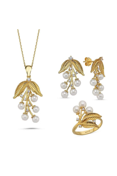 Zeytin Dalı Doğal İncili Küpe Kolye Yüzük Üçlü Set | | Birinci1926