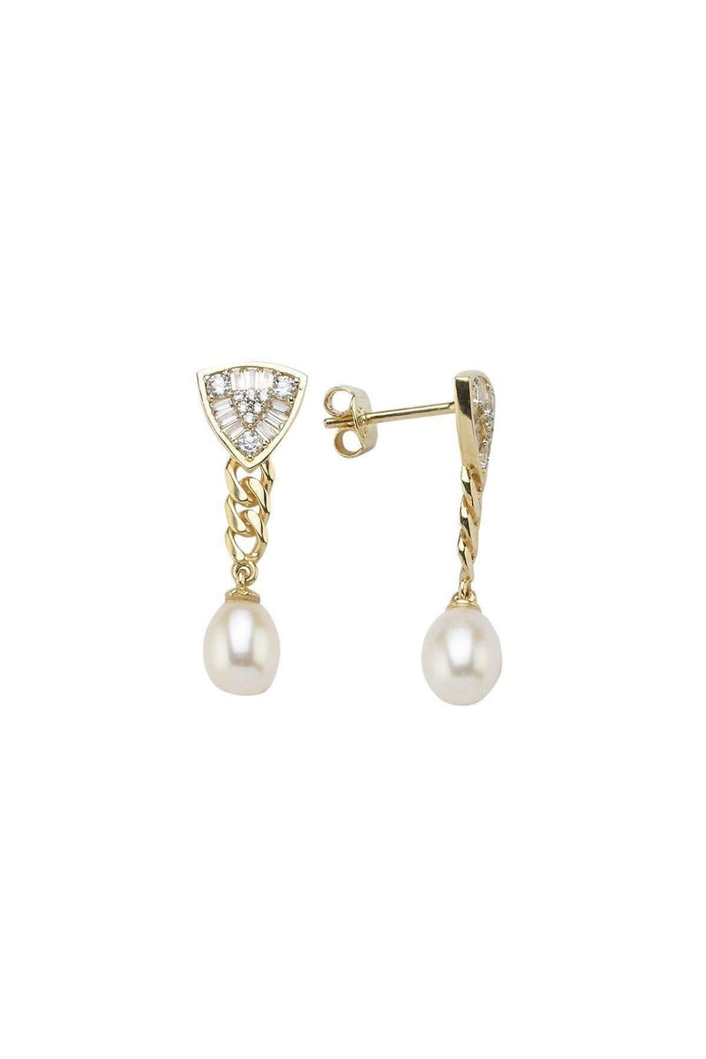 Product name: 14K Gold 7 mm Üçgen Modeli Baget Taşlı Doğal Pearl Küpe