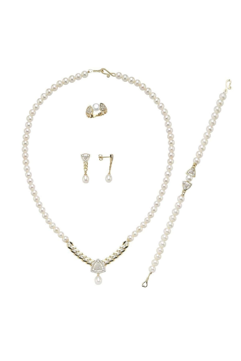 Product name: 14K Gold 6 mm Üçgen Model Baget Taşlı Doğal Pearl Küpe Kolye Bileklik Yüzük Dörtlü Set
