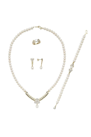 Üçgen Model Baget Taşlı Doğal İnci Küpe Kolye Bileklik Yüzük Dörtlü Set | | Birinci1926