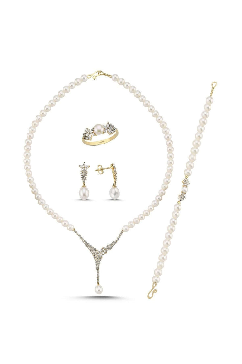Product name: 14K Gold 6 mm Zirkon Taşlı Doğal Pearl Küpe Kolye Bileklik Yüzük Dörtlü Set