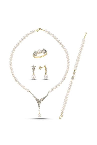 Zirkon Taşlı Doğal İnci Küpe Kolye Bileklik Yüzük Dörtlü Set | | Birinci1926