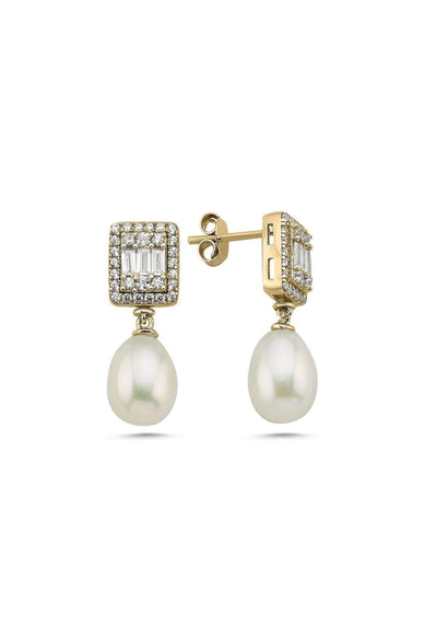 Product name: 14K Gold 8 mm Baget Taşlı Doğal Pearl Sallantılı Küpe