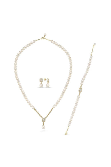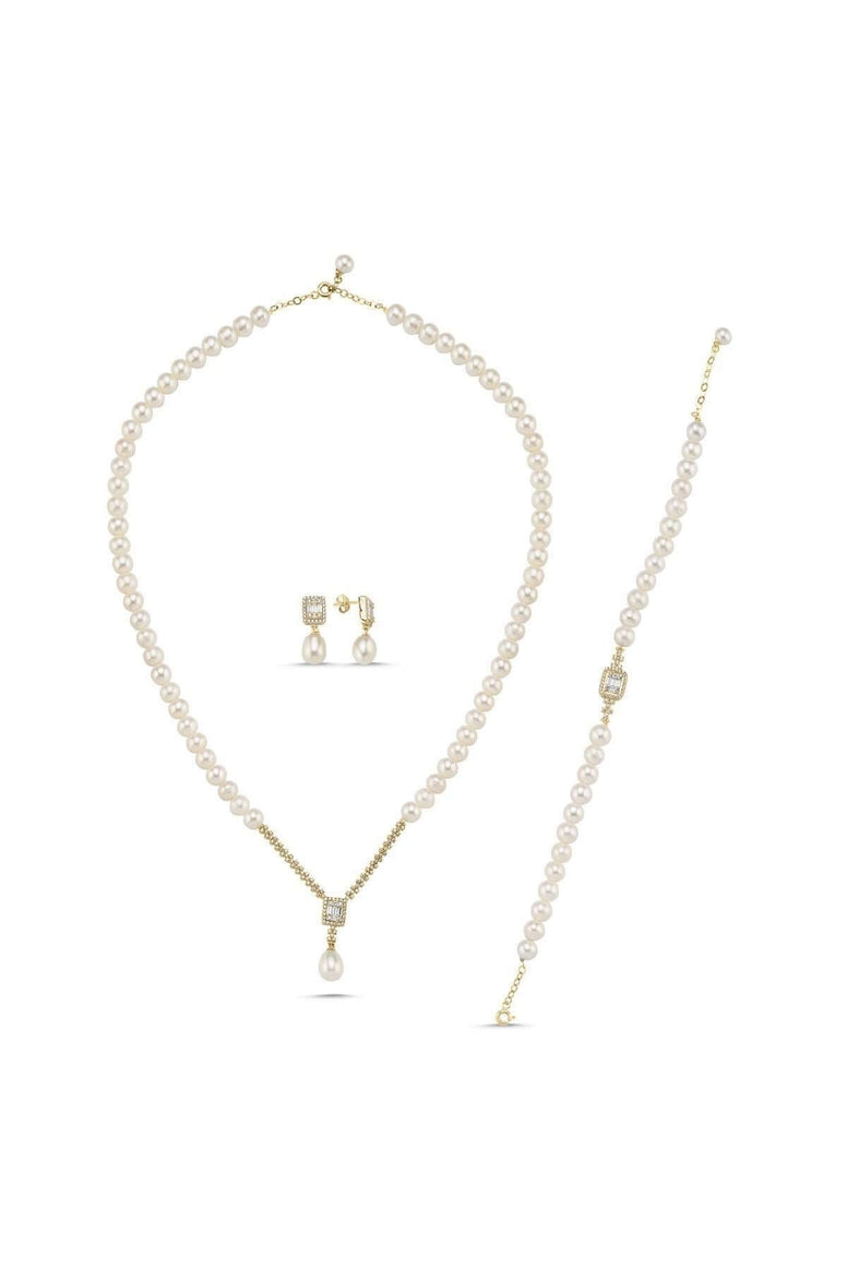 Baget Taşlı Doğal İnci Küpe Kolye Bileklik Üçlü Set | | Birinci1926