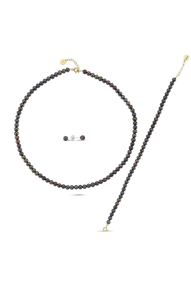 -Ürün Adı: 14K Gold 6 mm Siyah Pearl Küpe Kolye Bileklik Üçlü Set
