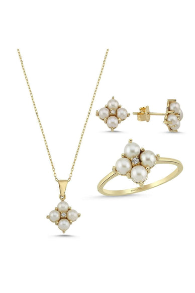 Dört Doğal İncili 0,24 Karat Pırlanta Küpe Kolye Yüzük Üçlü Set | | Birinci1926