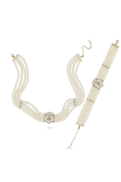 Lale Motif Four Lined Up Natural Pearl Necklace Bracelet Double Set