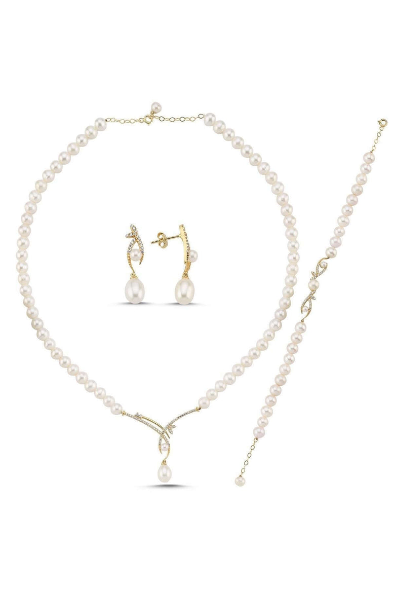 Yaprak Taşlı Doğal İncili Küpe Kolye Bileklik Üçlü Set | | Birinci1926